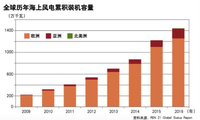 自1991年全球第一座海上風電場在丹麥開始運行以來,海上風電發展已經走過了二十余年。早期海上風電發展速度緩慢,2008年以后,隨著風電技術的進步以及投資者對海上風能資源認識的不斷加深,已經有多個國家將海上風電作為未來風電發展的主要方向海上風電保持了持續增長的良好勢頭。