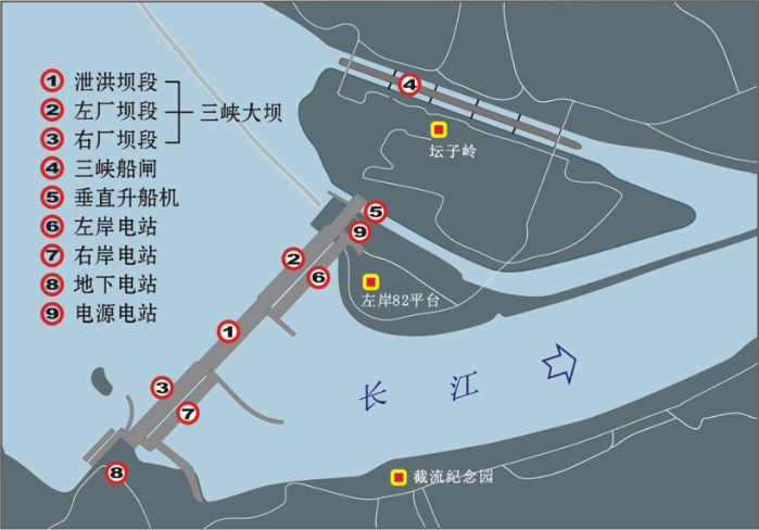 從長江左岸至右岸三峽樞紐建筑物的布置是:三峽船閘,垂直升船機,左岸非溢流壩段和電源電站、左岸電站,泄洪壩段,右岸非溢流壩段和右岸電站,右岸地下電站。