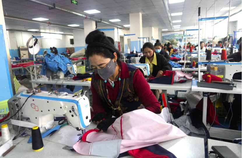 在穹鵬民族手工藝品基地,縫紉機(jī)的嗒嗒聲此起彼伏,交織出一件件精美的手工藏式服飾、校服。