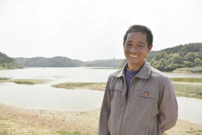▲韶口村委會主任郭明在水庫邊接受采訪 攝影:徐強