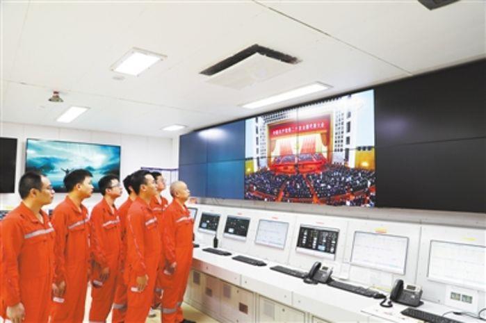 10月16日上午,“深海一號(hào)”氣田持續(xù)穩(wěn)定生產(chǎn)作業(yè),現(xiàn)場(chǎng)員工100余人在氣田黨員活動(dòng)室、餐廳、中控室收看黨的二十大開(kāi)幕直播。