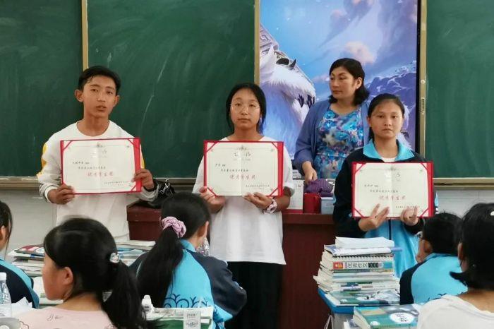 ▲?木坡布前(左一)在教室講臺領獎狀