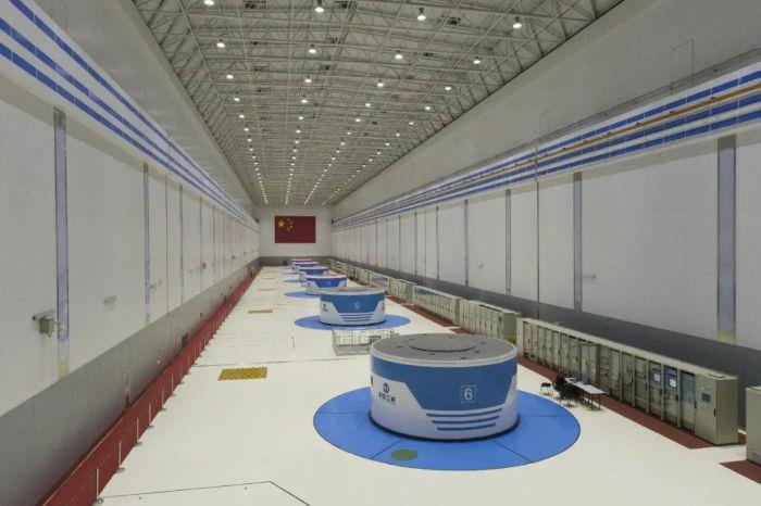 長龍山電站坐落在群山之間,沿進廠交通洞向山體內行進1.2公里,來到長龍山電站的廠房。232米長的廠房內,6臺35萬千瓦的機組一字排開,其中4臺機組上方亮起一圈紅色燈光,通過機頂罩的小窗口可以看到飛速旋轉的轉子。