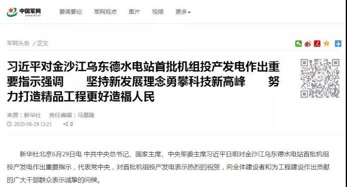 【中國軍網(wǎng)】習(xí)近平對金沙江烏東德水電站首批機組投產(chǎn)發(fā)電作出重要指示強調(diào) 堅持新發(fā)展理念 勇攀科技新高峰 努力打造精品工程更好造福人民