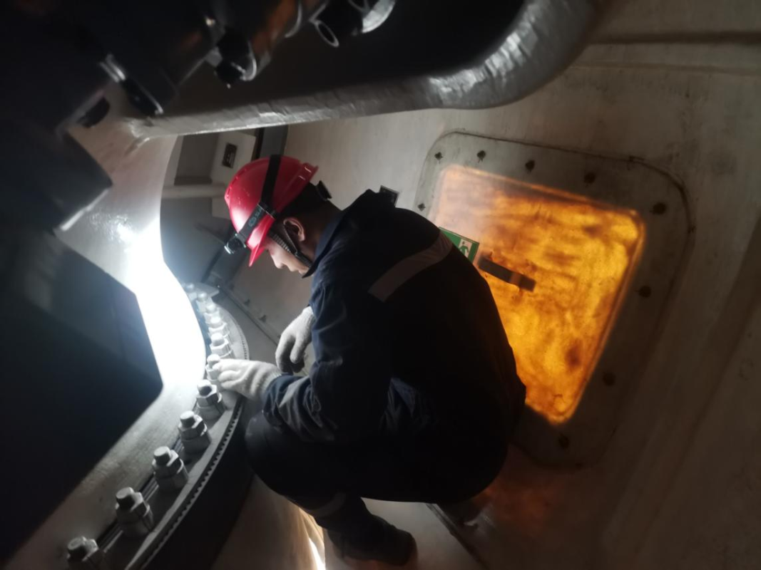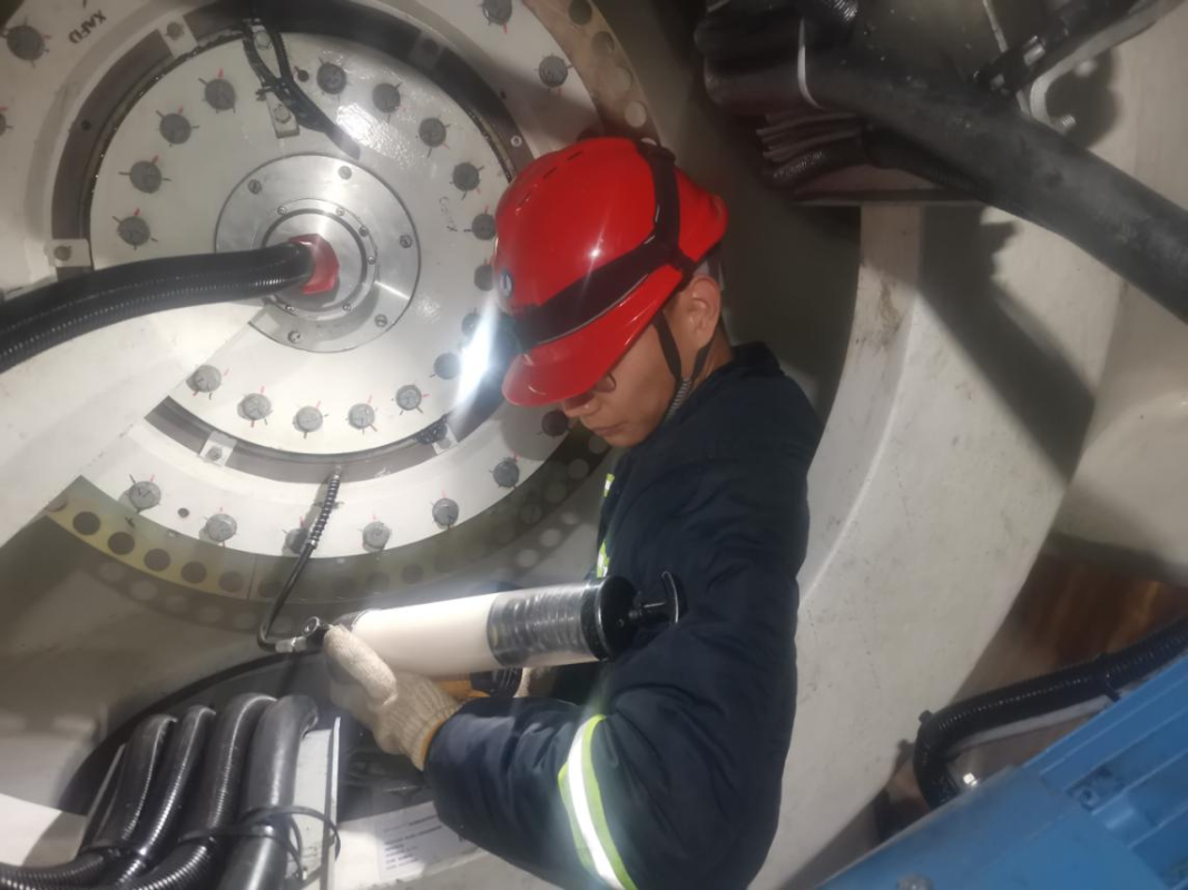 風機機艙狹小,徐亞闖頭頂鋼板,用手電照著偏航系統剎車盤和制動器擋塊,檢查剎車盤表面是否存在犁溝,制動器擋塊安裝是否正確。“我檢查了80臺風機剎車盤表面、169組3孔制動器擋塊和311組5孔制動器擋塊,將存在的問題記錄在案。”