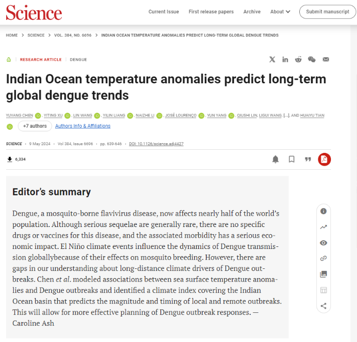 國家工程中心科研人員陳宇楊作為第一作者,在《科學》發(fā)表《印度洋溫度異常預(yù)測全球登革熱長期趨勢》一文,該文以三峽集團長江流域氣候預(yù)測與環(huán)境評估研究工作為基礎(chǔ),開發(fā)基于氣候預(yù)測的環(huán)境健康模型。該模型可將登革熱流行預(yù)警提前9個月,可靠性大幅提升至70%,在氣候變化和流域環(huán)境健康前沿研究領(lǐng)域取得重大創(chuàng)新突破。后續(xù),研究團隊將進一步優(yōu)化氣候預(yù)測模型,為三峽集團水風光資源預(yù)測和城市內(nèi)澇風險預(yù)警提供有力支撐。