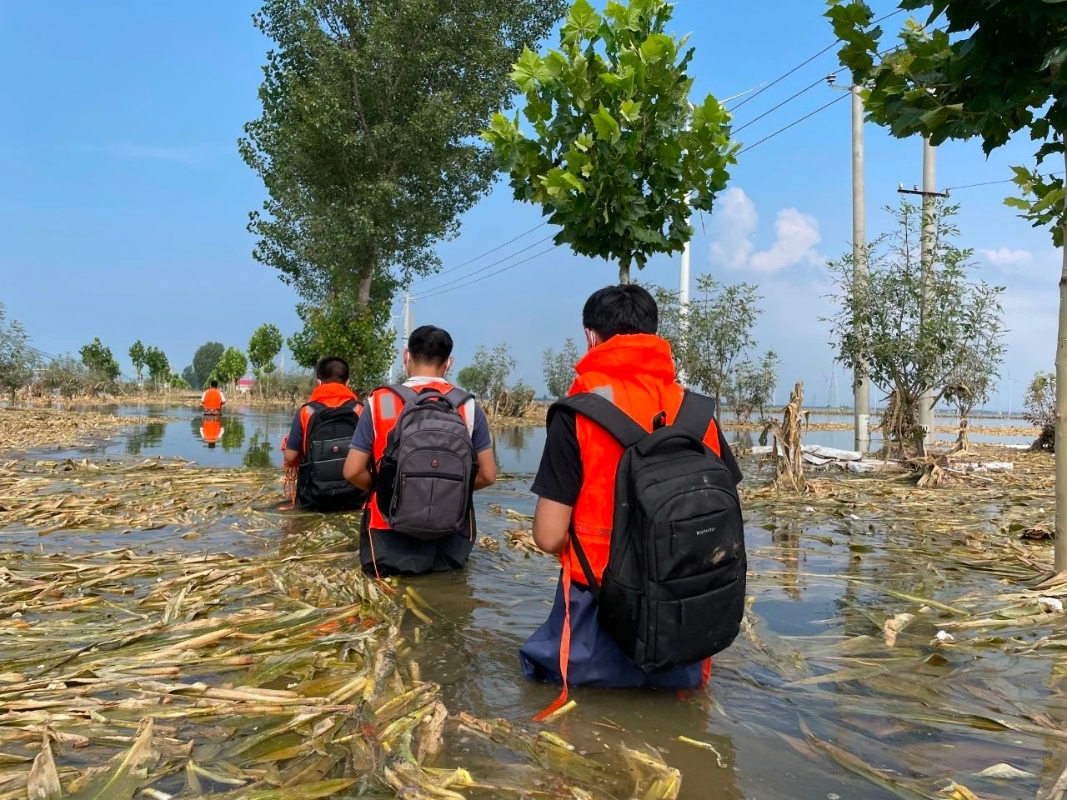 遇到漂浮物過多時,宋要偉干脆跳進(jìn)及腰深的洪水,在艇前開路。